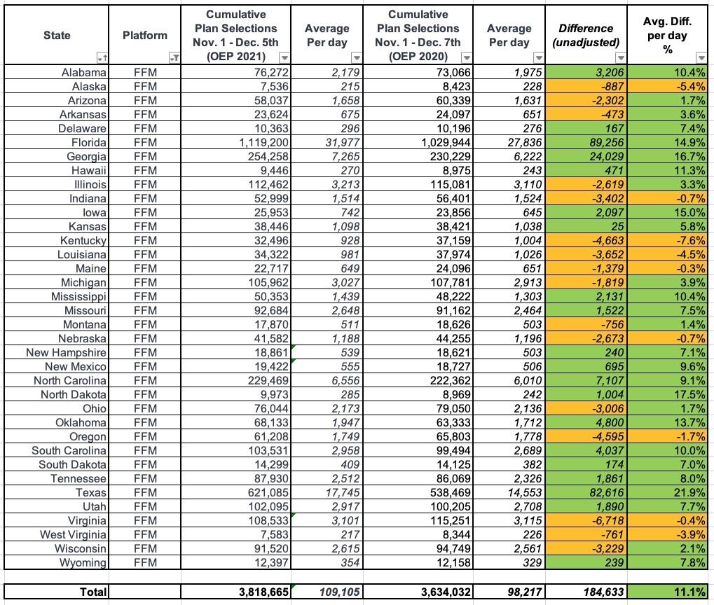 With the fifth week included, I can compare 35 days in OEP 2021 vs. 37 days in OEP 2020, which is still apples to oranges but a lot closer. With Thanksgiving out of the way, enrollments understandably shot back up again, although not as much as last year; so far the 2021 season is running 4.0% higher than last year on a daily basis: