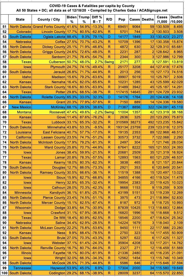 Here's the top 100 counties ranked by per capita COVID-19 fatalities as of Friday, December 18th (click image for high-res version):