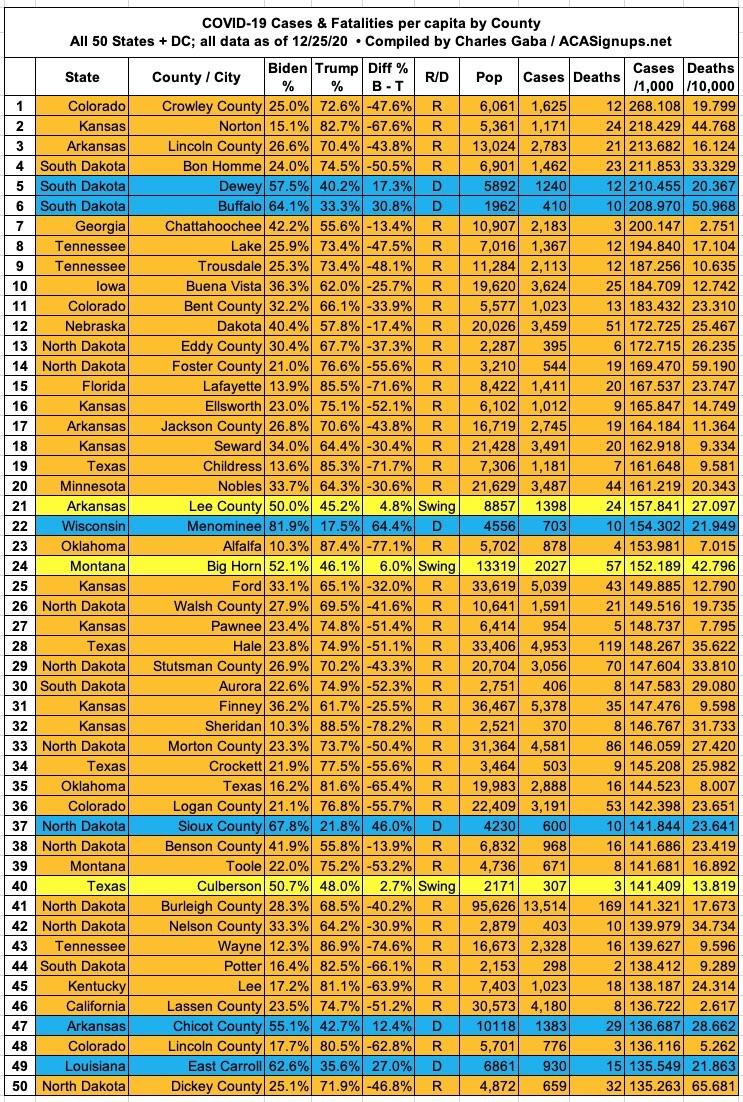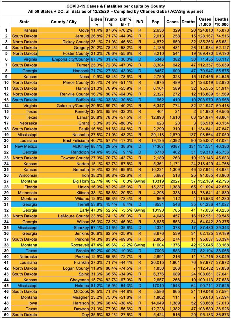 Here's the top 100 counties ranked by per capita COVID-19 fatalities as of Friday, December 25th (click image for high-res version):