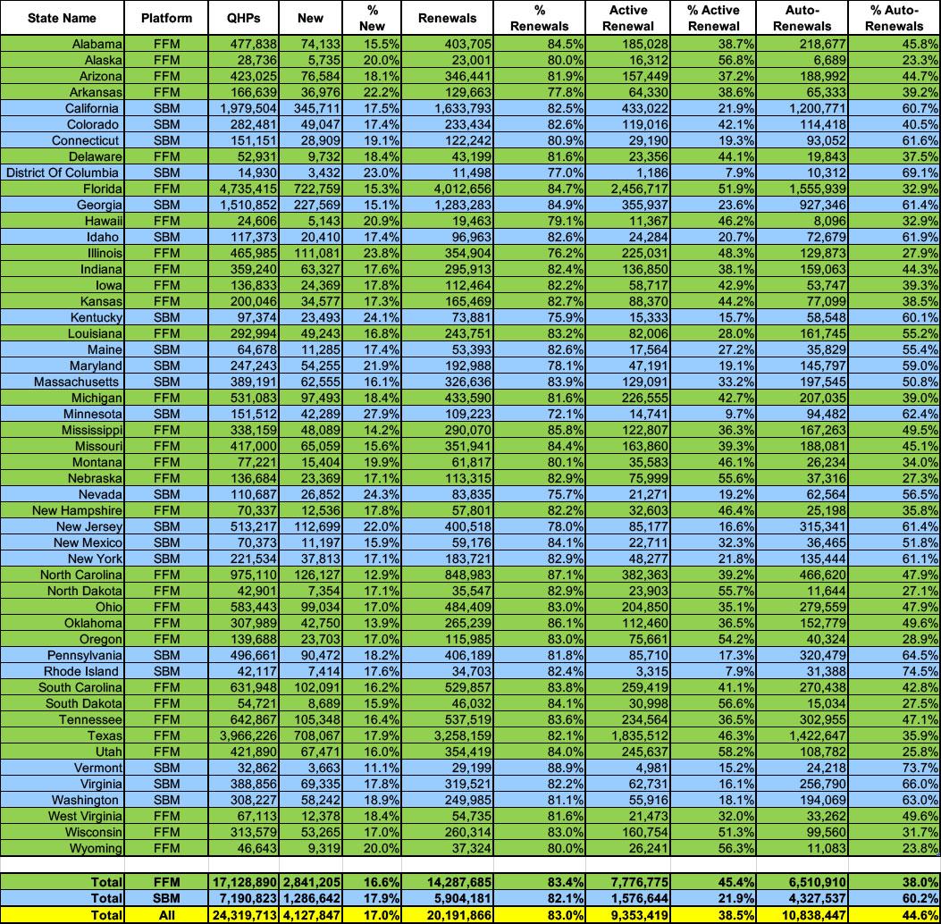First up: Breaking out new enrollees vs. existing enrollees who either actively re-enroll in an exchange plan for another year or who passively allow themselves to be automatically renewed into their current plan (or to be "mapped" to a similar plan if the current one is no longer available).