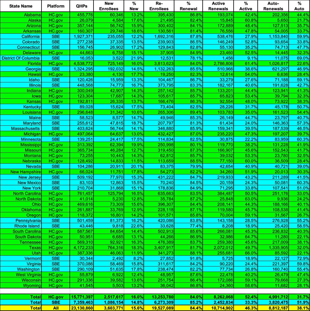 First up: Breaking out new enrollees vs. existing enrollees who either actively re-enroll in an exchange plan for another year or who passively allow themselves to be automatically renewed into their current plan (or to be "mapped" to a similar plan if the current one is no longer available).