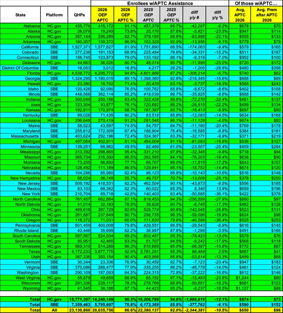 Next, here's the state-level breakout of how many enrollees are actually receiving Advanced Premium Tax Credit (APTC) assistance this year (after the enhanced APTC subsidies expired) versus last year.