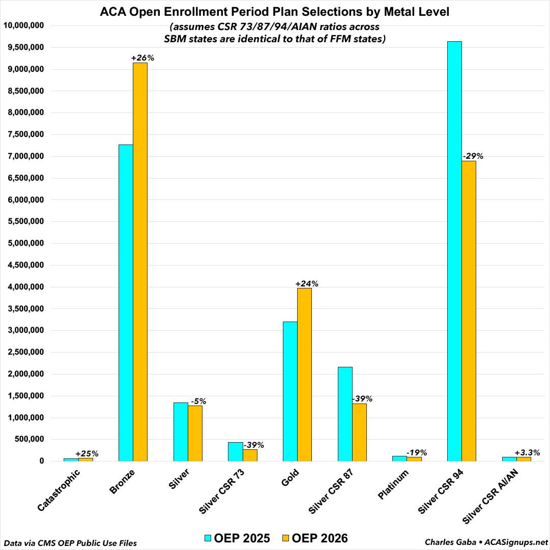 The thing is, as I noted last week, a lot of ACA enrollees have CSR plans, even if this has plummeted from 50% in 2025 to 37% of them this year....around 8.6 million people. And of those, at least across the 30 states hosted on the federal exchange, the vast majority receive the highest tiers (over 81% have either CSR 94 or CSR AI/AN coverage; another 15% have CSR 87 plans).