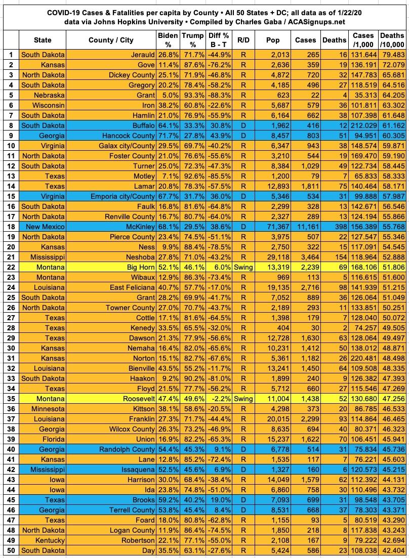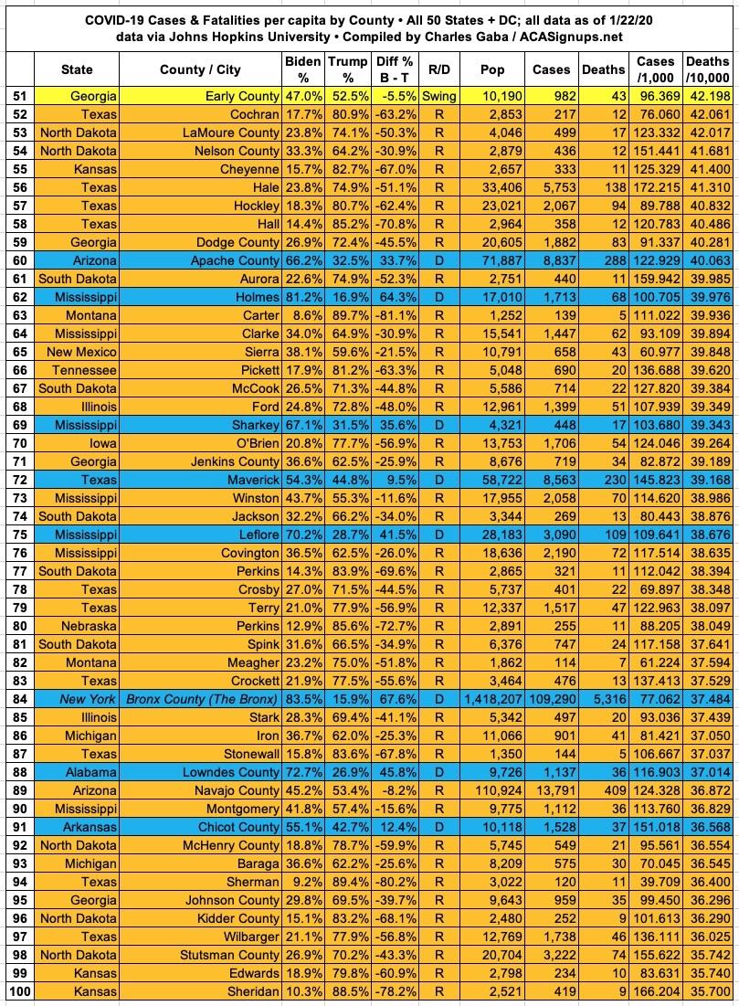 Here's the top 100 counties ranked by per capita COVID-19 fatalities as of Friday, January 22nd, 2021 (click image for high-res version):