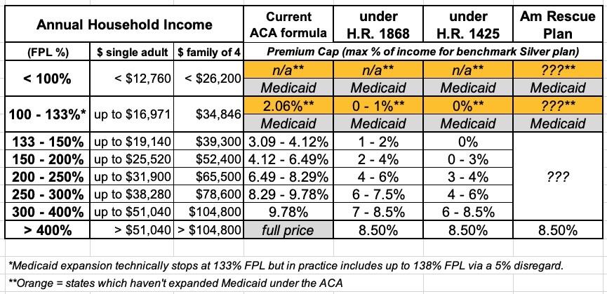 I have no idea what the subsidy formula would look like under the #AmRescuePlan other than that it would top out at 8.5%. My guess is that it'll follow the H.R. 1868 formula, but who knows? I also don't know whether it would do anything for those caught in the Medicaid Gap (below the 100% FPL margin), since Biden's larger healthcare vision includes moving those folks onto a new Public Option plan at no cost.