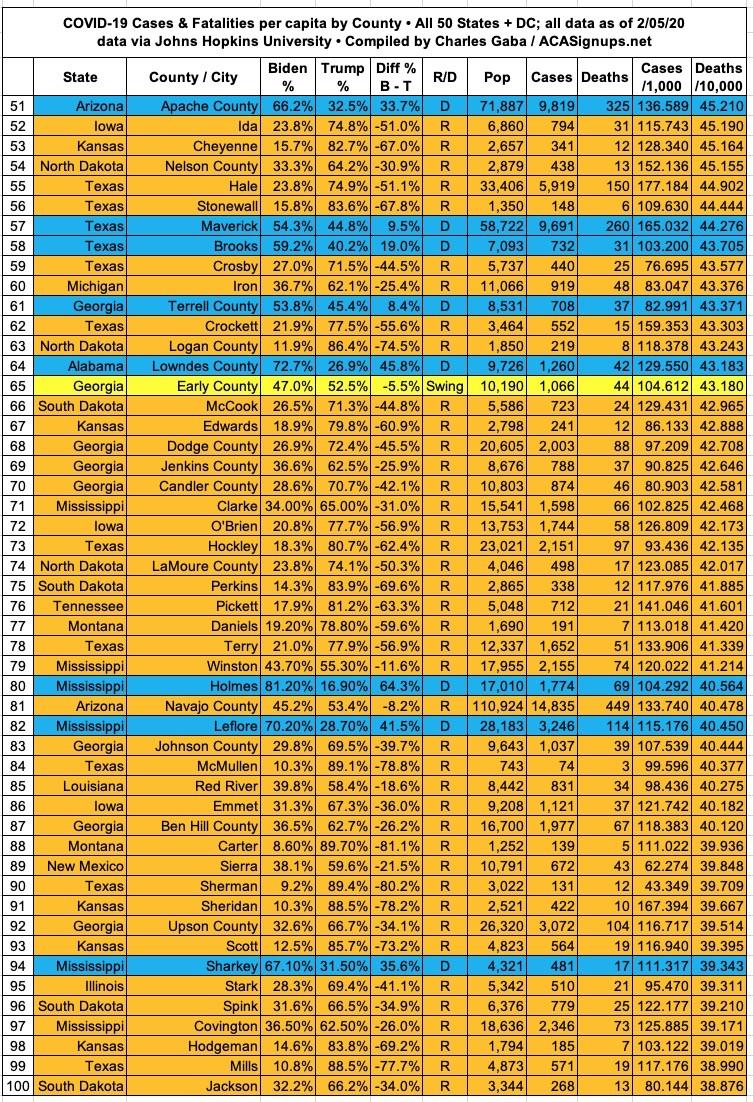 Here's the top 100 counties ranked by per capita COVID-19 fatalities as of Friday, February 5th, 2021 (click image for high-res version):