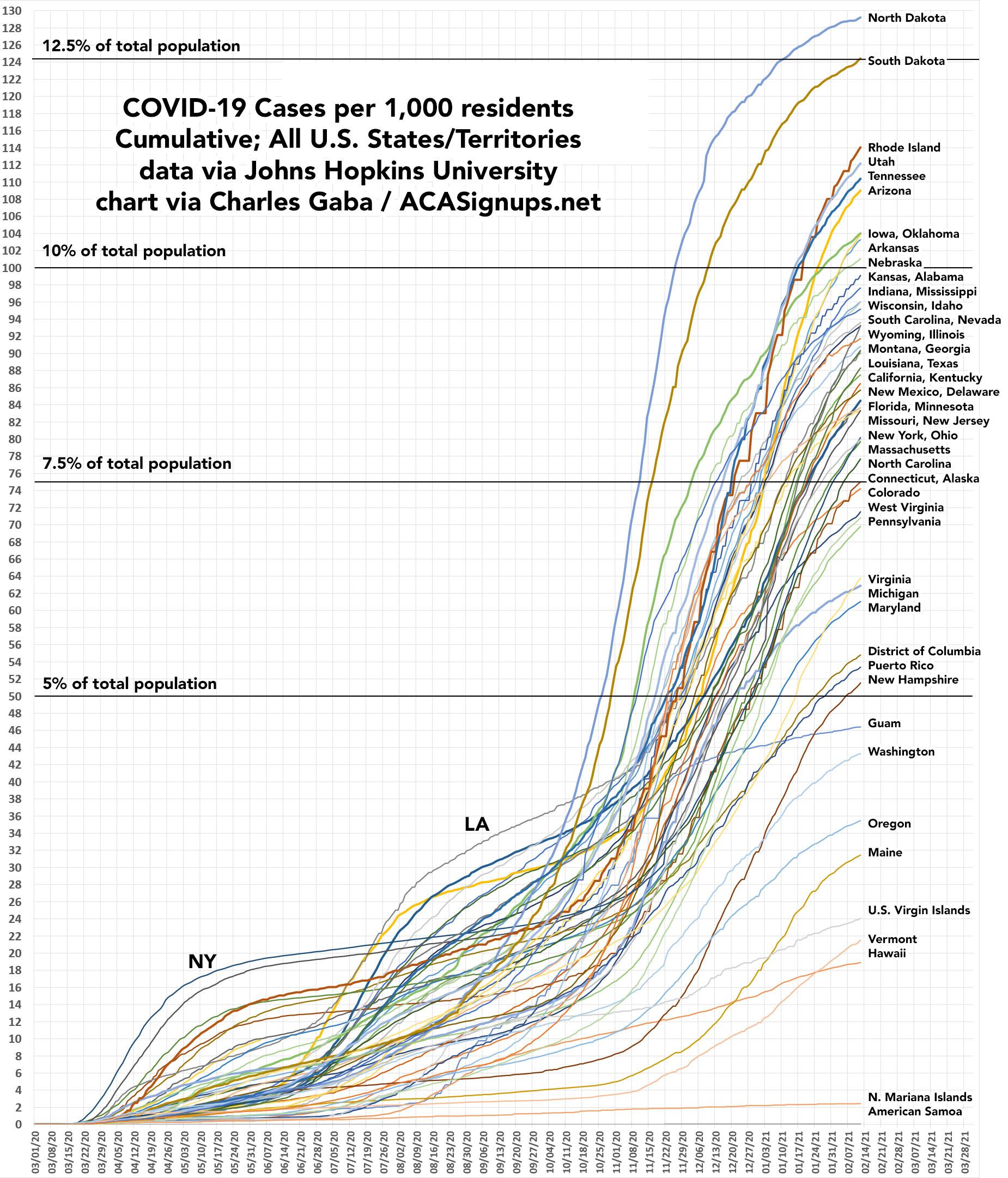 1 out of every 8 residents of North & South Dakota's entire populations have tested positive for COVID-19 over the past year.