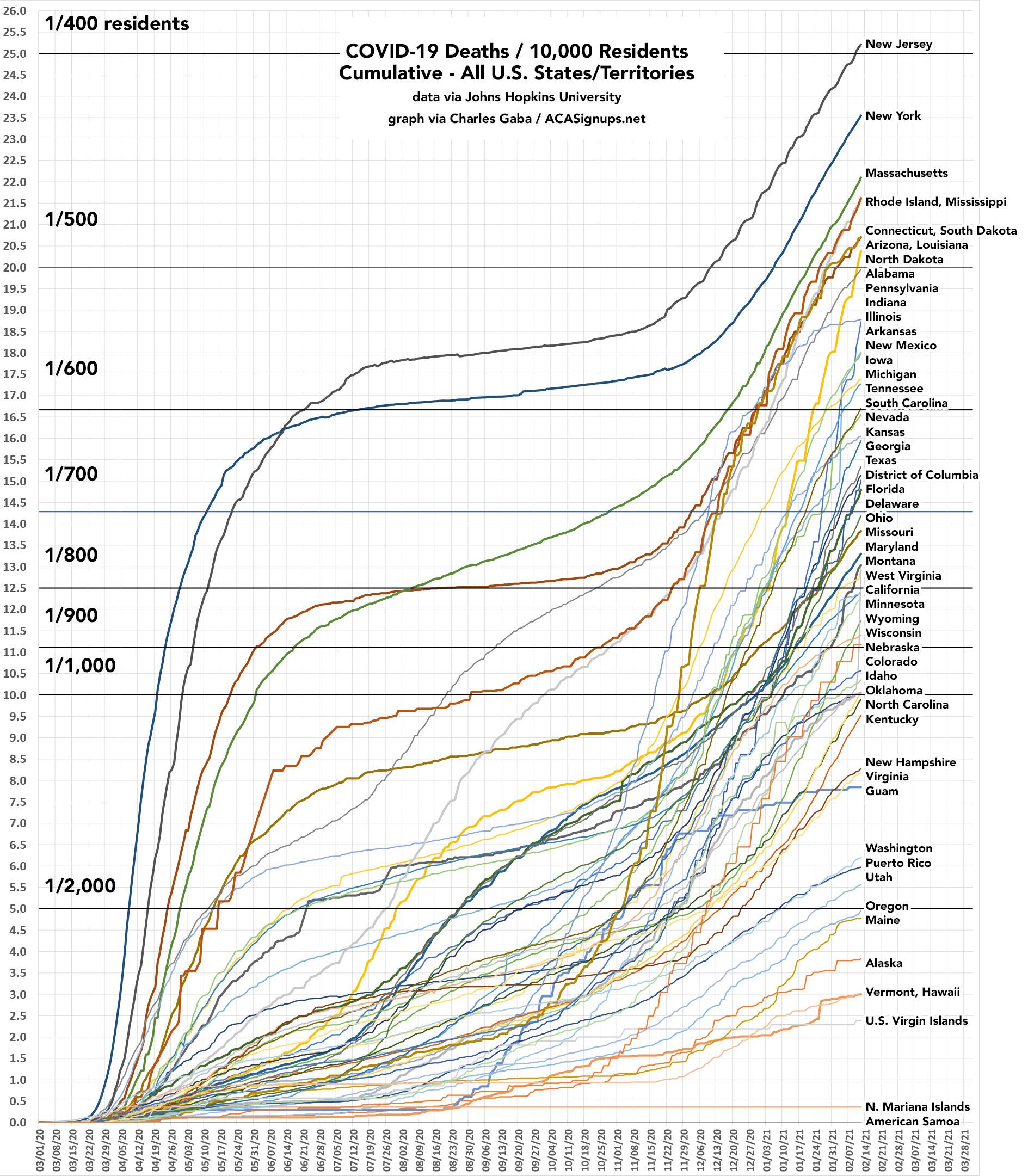 I've done my best to label every state/territory, which obviously isn't easy to do for most of them given how tangled it gets in the middle. For cases per capita, the most obvious point is that New York and New Jersey, which towered over every other state last spring, are now utterly dwarfed by North & South Dakota, although things are getting pretty horrible everywhere now.