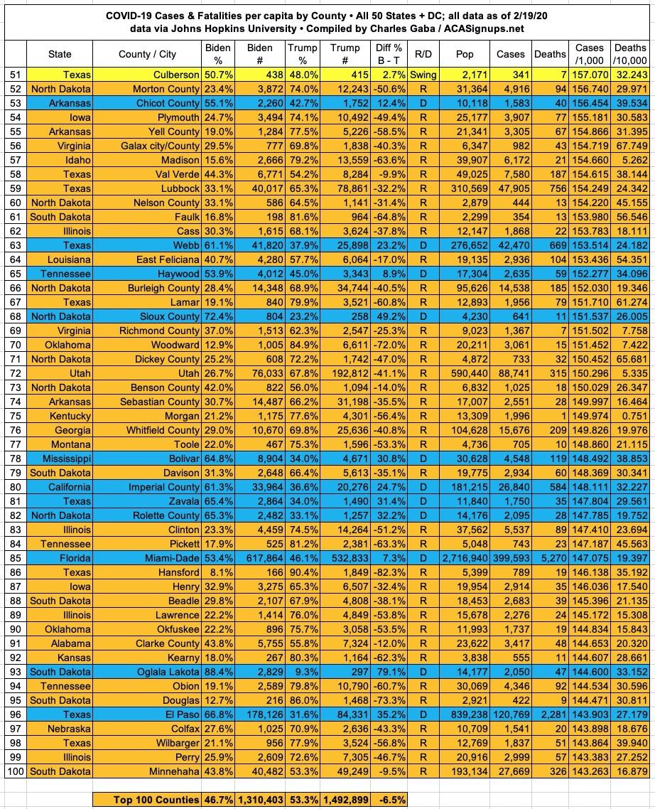 With these updates in mind, here's the top 100 counties ranked by per capita COVID-19 cases as of Friday, February 19th, 2021 (click image for high-res version).