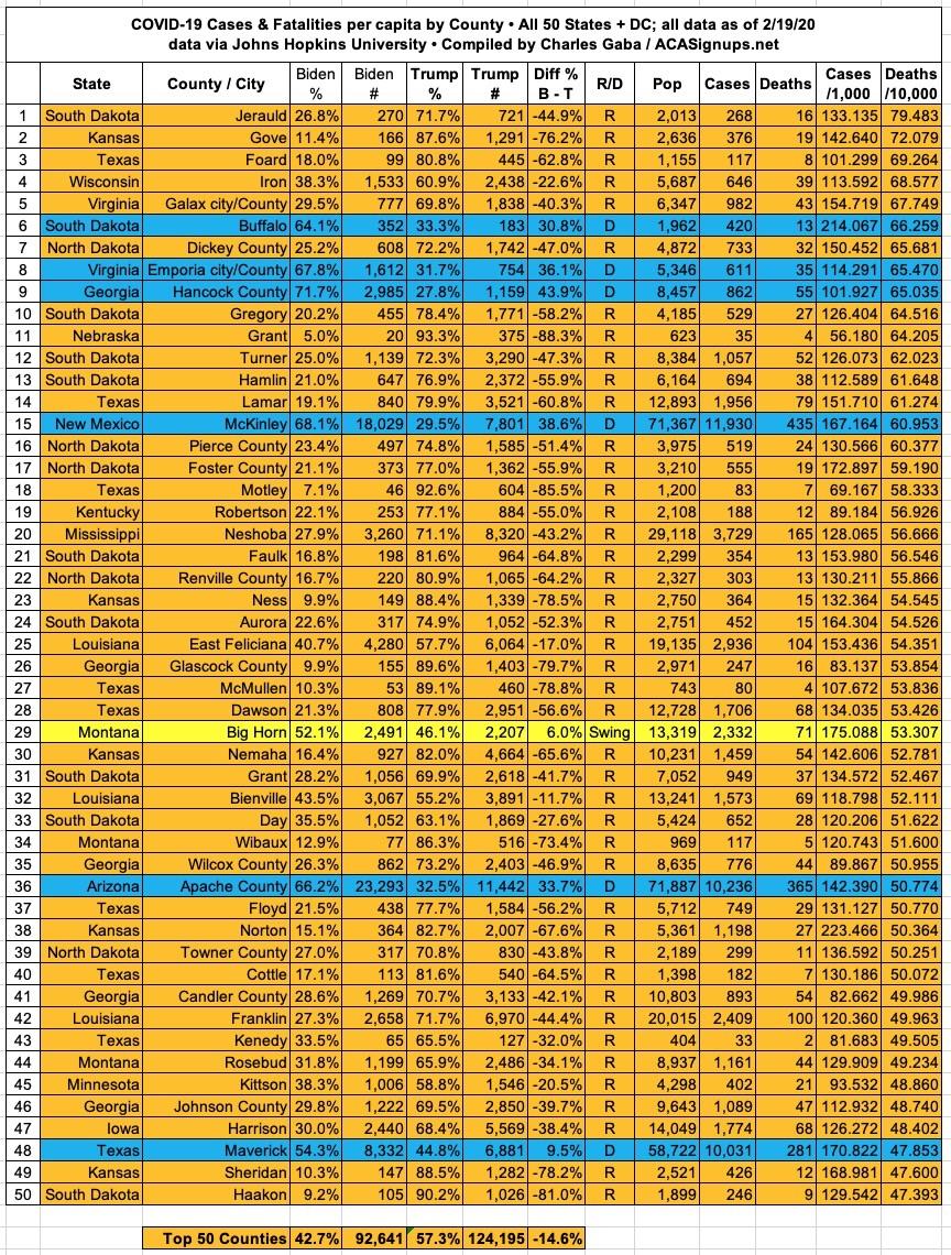 Here's the top 100 counties ranked by per capita COVID-19 fatalities as of Friday, February 19th, 2021 (click image for high-res version):