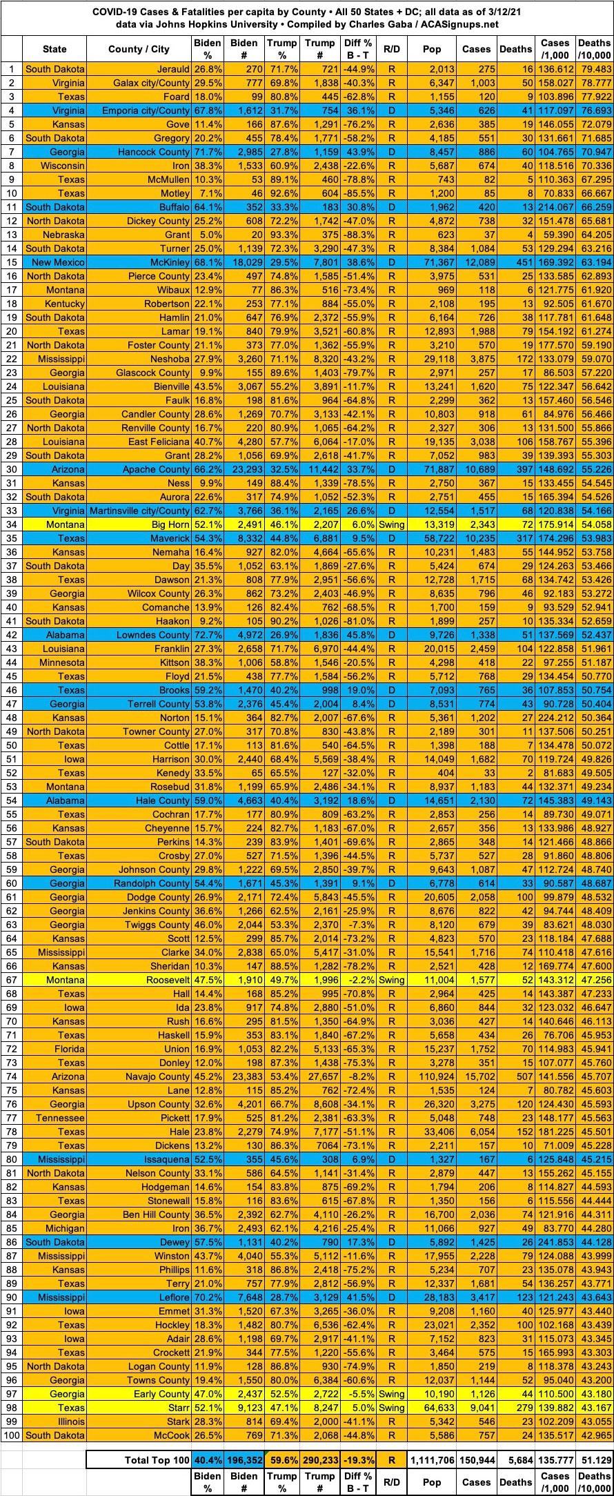 Here's the top 100 counties ranked by per capita COVID-19 fatalities as of Thursday, March 11th, 2021 (click image for high-res version):