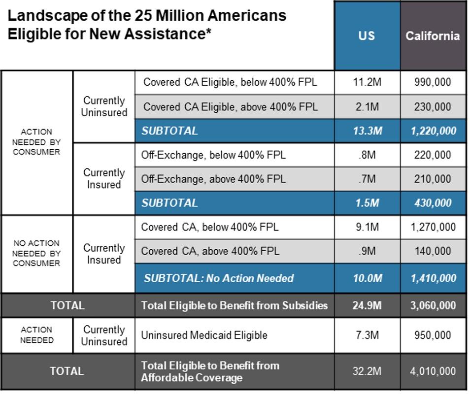 • An estimated 3 million Californians are among the 25 million Americans who stand to benefit from the new and expanded subsidies, which will lower premium costs and make health care coverage more affordable than ever.