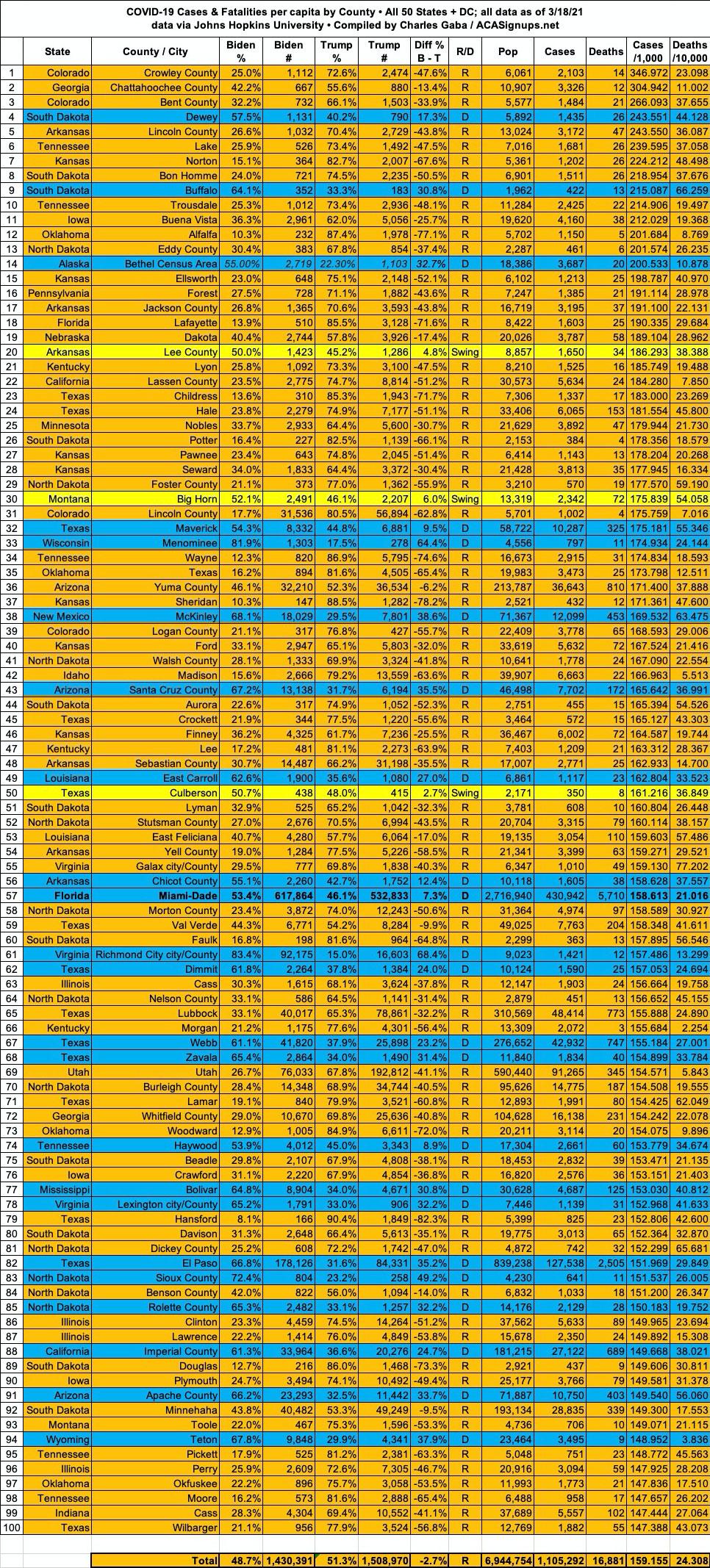 Here's the top 100 counties ranked by per capita COVID-19 fatalities as of Thursday, March 18th, 2021 (click image for high-res version):