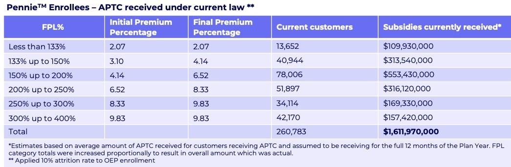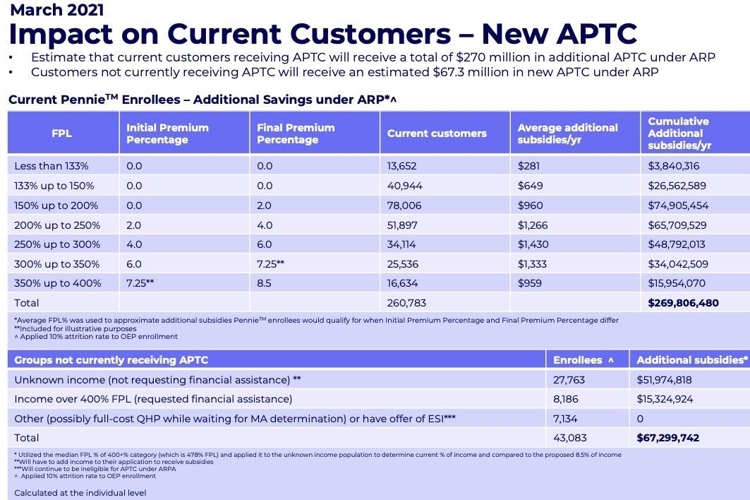 Pennie estimates that without the ARP, their current enrollees would receive around $1.61 billion in federal APTC subsidies over the course of 2021 (assuming around a 10% net attrition rate, which sounds low to me, but then again, in the age of COVID anything's possible...and the ARP's extra subsidies are gonna reduce the attrition rate anyway):