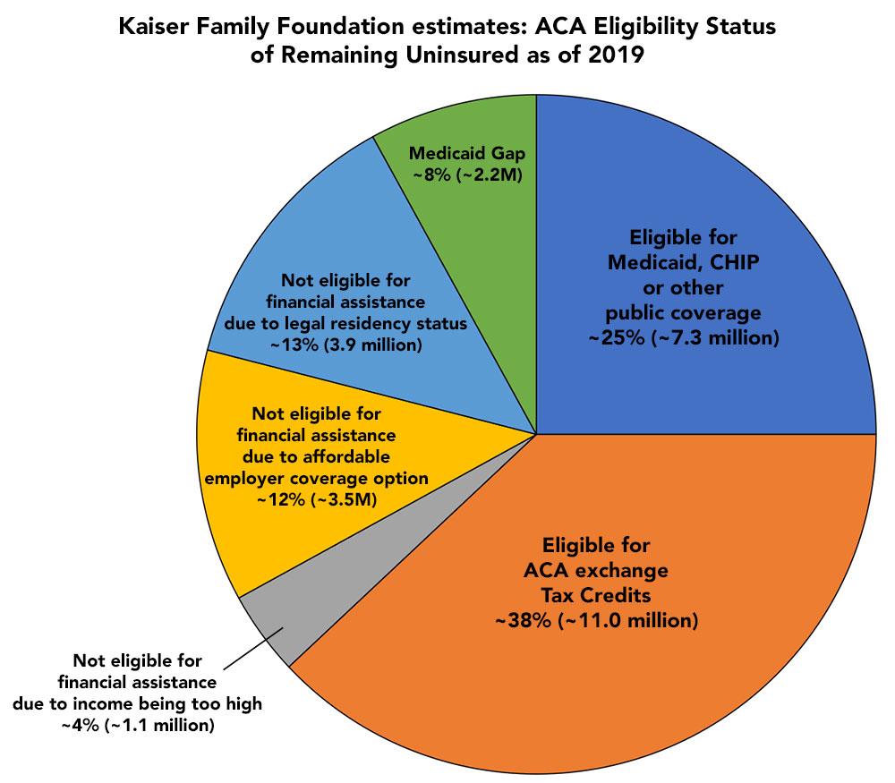 The Kaiser Family Foundation has updated their estimated breakout of the entire uninsured population of the United States as of 2019, and what sort of healthcare coverage they're eligible for thanks to the Affordable Care Act and the American Rescue Plan's expanded/enhanced subsidies.