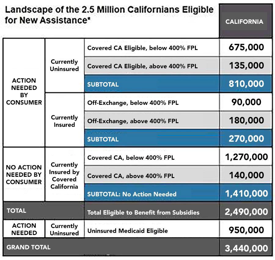 • The new law will help an estimated 2.5 million Californians, including the uninsured and people enrolled directly through a health insurance carrier, by injecting $3 billion into the state’s economy.