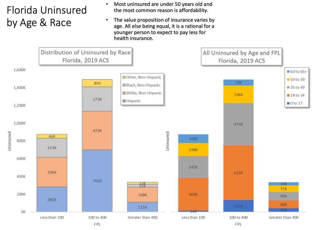 First, here's a breakout of Florida's current uninsured population by age, race, income levels and category:
