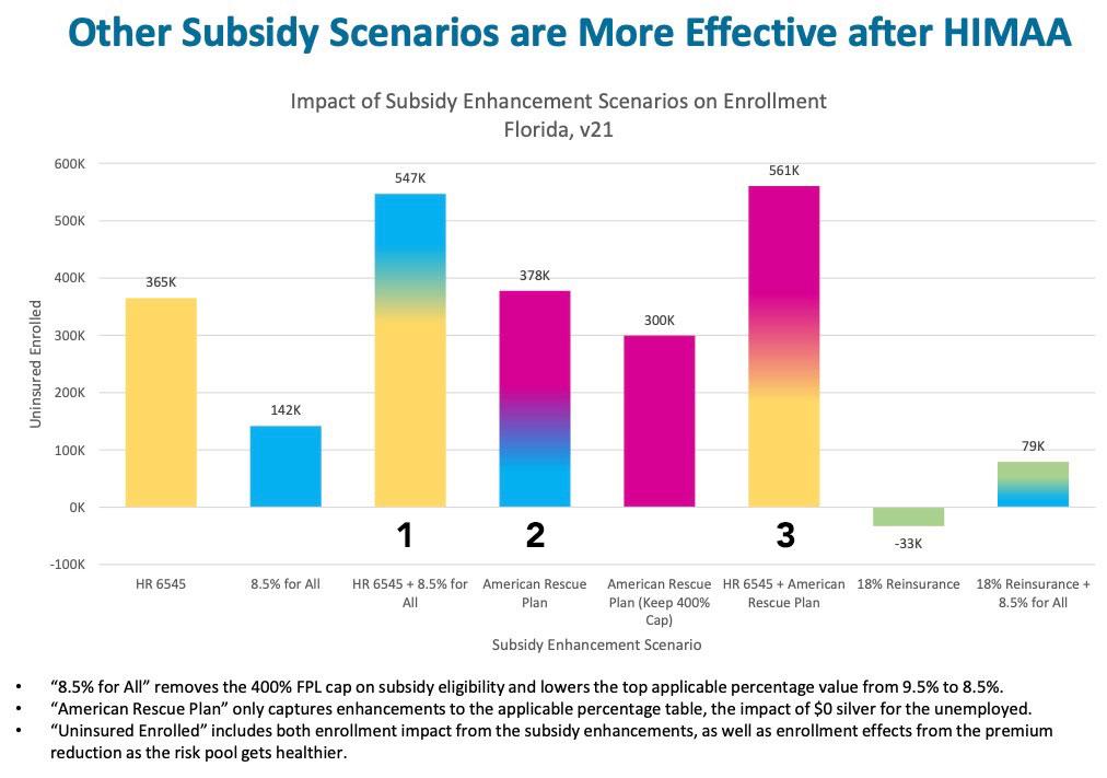 According to this analysis, in Florida, ARP/369 as it stands would increase the amount of subsidies spent per total exchange enrollee (including currently subsidized enrollees) by around 16%, which wouldn't be bad for a 19% increase in ACA exchange enrollment (I'm assuming 2.0 million is the baseline).