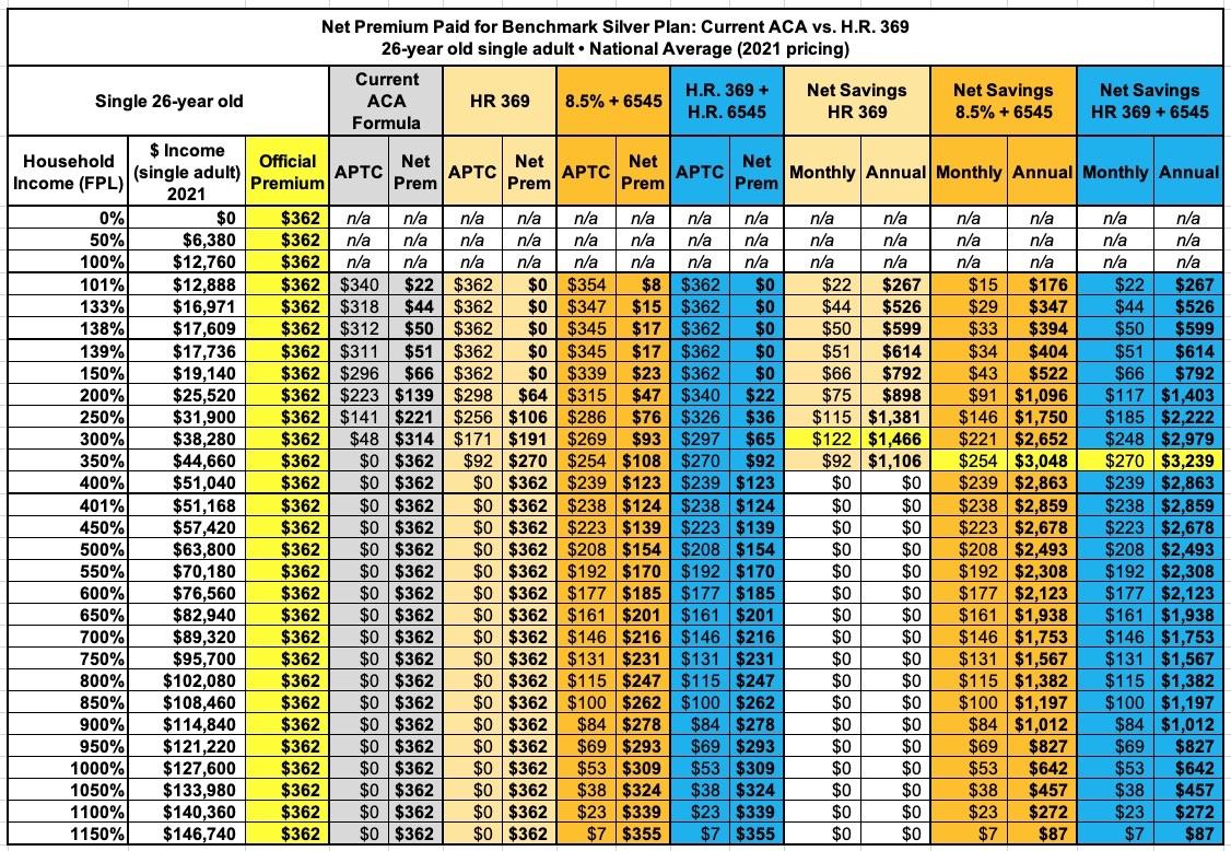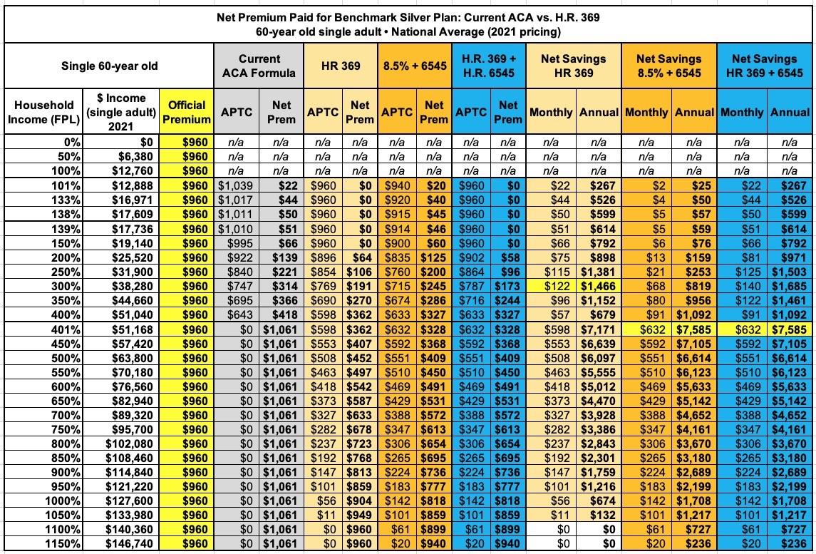 FIRST, the American Rescue Plan (which basically mirrors HR 369) is a damned good upgrade over the current APTC formula. It's already been passed and covers things through the end of 2022.