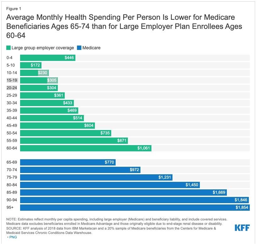 ...While health care spending increases with age within a given payer type, our analysis shows substantially higher per person spending among 60-64 year olds in large employer plans than among 65-69 year olds in Medicare, primarily reflecting the differences in payment rates noted above.
