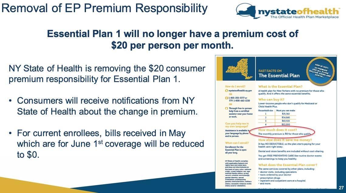 Total enrollment in New York's Essential Plan is around 885,000 this year. Unfortunately, I have no idea what the breakout is between the < 150% and >150% FPL thresholds, so I don't know how many of those 885K will see these additional cost savings, but I'm assuming it's a least a couple hundred thousand.
