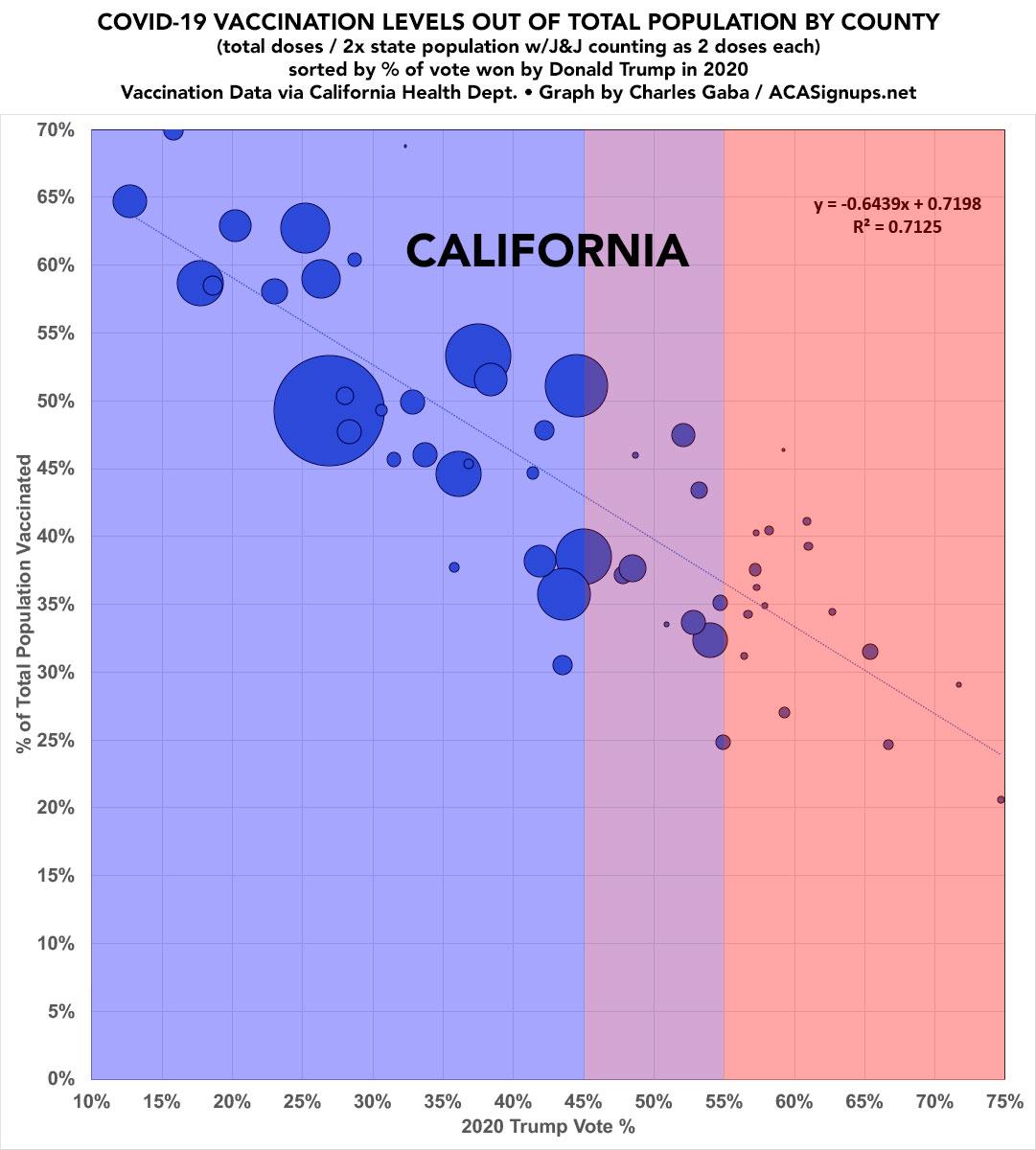 Now that I've developed a standardized format/layout & methodology for tracking both state- and county-level COVID vaccination levels by partisan lean (which can also be easily applied to other variables like education level, median income, population density, ethnicity, etc), I've started moving beyond my home state of Michigan. Here's California, and it's pretty eye-opening.
