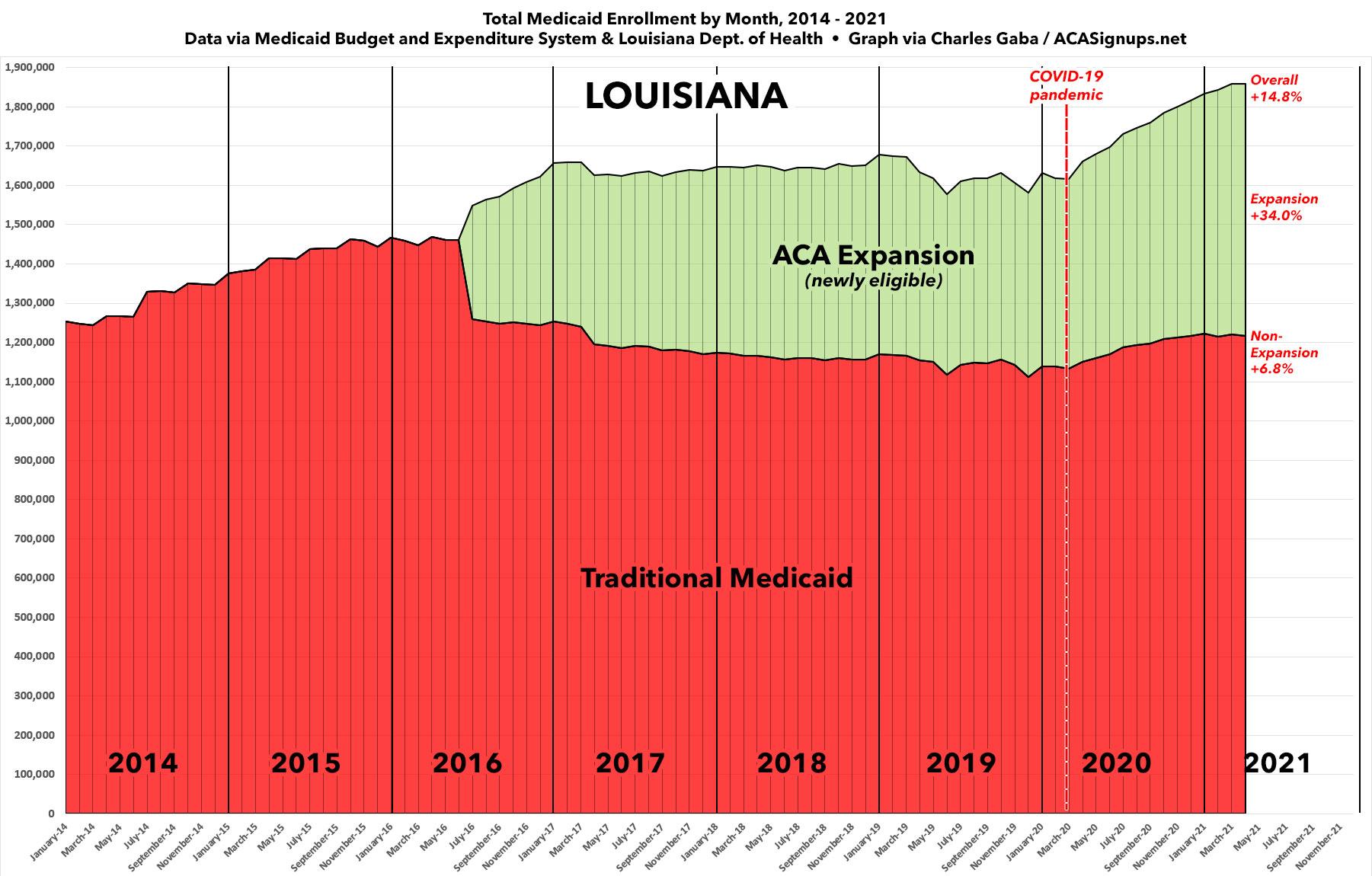 ACA Medicaid expansion didn't go into effect until halfway through 2016, but since then total enrollment averaged between 1.6 - 1.7 million people in LA. Since COVID hit last February, enrollment in non-ACA Medicaid has only increased a modest 6.8%, but ACA expansion enrollment has gone up by 34% for an overall increase of 14.8% statewide.