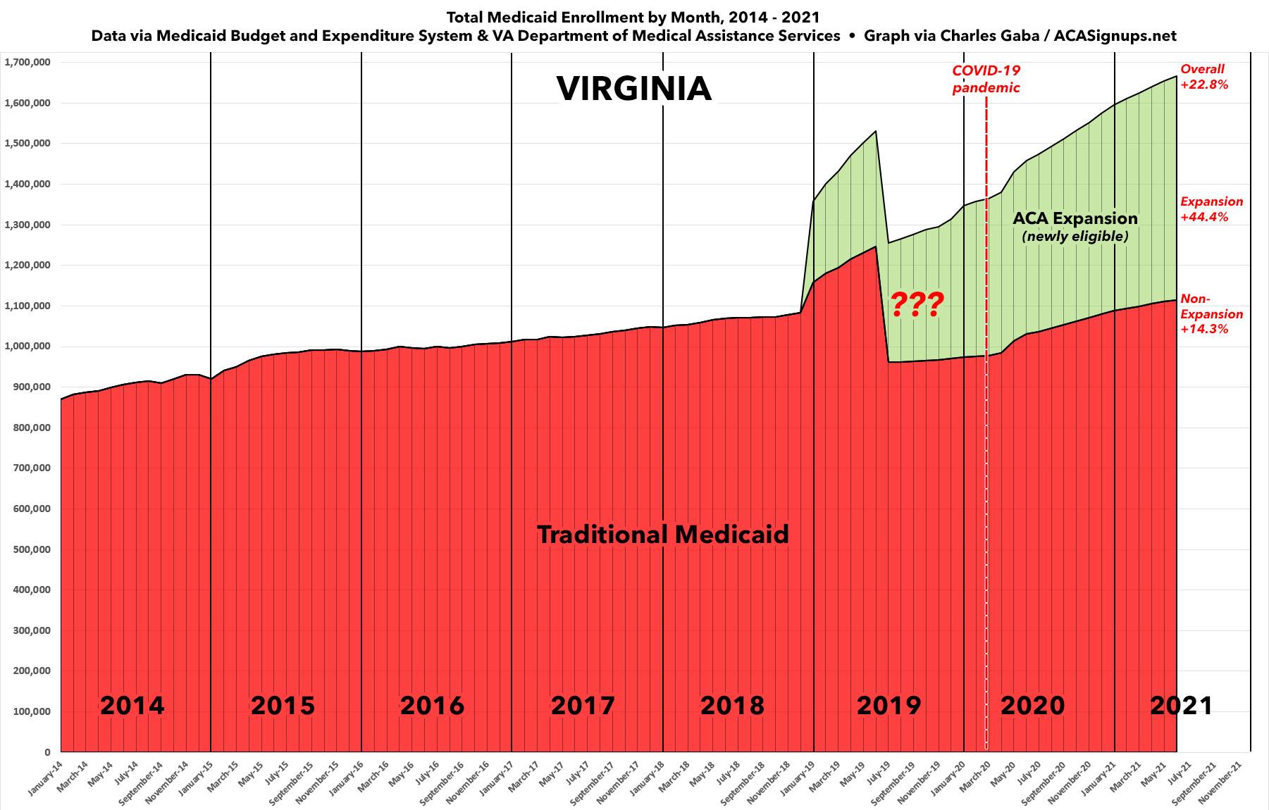 Virginia just expanded Medicaid under the ACA starting in 2019. The official CDC data shows a very strange, sudden drop-off in non-ACA Medicaid enrollment in July of that year, followed by a slow, gradual increase which has only accellerated since the COVID pandemic hit in early 2020. Since then, non-ACA Medicaid enrollment has gone up 14%, expansion enrollment has increased by over 44% and overall enrollmetn is up nearly 23% from pre-COVID days.