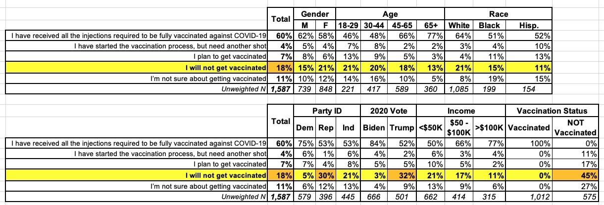 The good news is that the other 55% of those ~87 million adults are gettable: Again, 11% say they've gotten their first shot, so it's just a matter of making sure they follow up with the 2nd one; 17% say they plan to do so (get a move on, folks! the Delta variant is upon us!), and 27%...or perhaps 23.5 million...are "gettable" with the right message, assistance, etc.