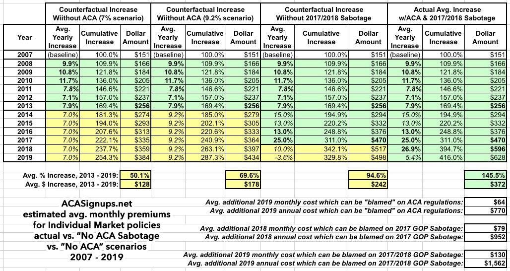 In a non-ACA universe, to the best of my reckoning, individual market policy premiums would have increased anywhere from50% - 70% from 2013 to 2019, to around $384 - $434/month per person on average.