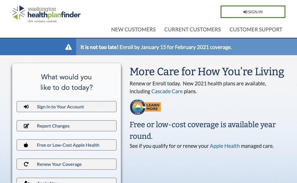 As of Dec. 16, about 210,000 Washingtonians have signed up for 2021 coverage, including almost 30,000 new customers. Among new customers, 41% have selected a Cascade Care plan. Cascade Care plans cover more services prior to meeting a deductible, including primary care visits, mental health services, and generic drugs. Customers who need to renew their plan for 2021 can sign in to their Washington Healthplanfinder account using the WaPlanfinder Mobile App or on WAHealthplanfinder.org and easily update and renew their coverage. Additionally, some customers may find that they qualify for free or low-cost coverage.