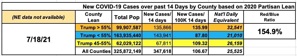 Now that it's become crystal clear that there's a massive discrepancy between the blue and red counties when it comes to COVID-19 vaccination rates, combined with the fact that the much more dangerous Delta variant has now become the dominant version of COVID spreading across the U.S., I decided it was time to revisit the county-level case data to see if that huge Blue/Red vaccination divide is showing up in newer cases.