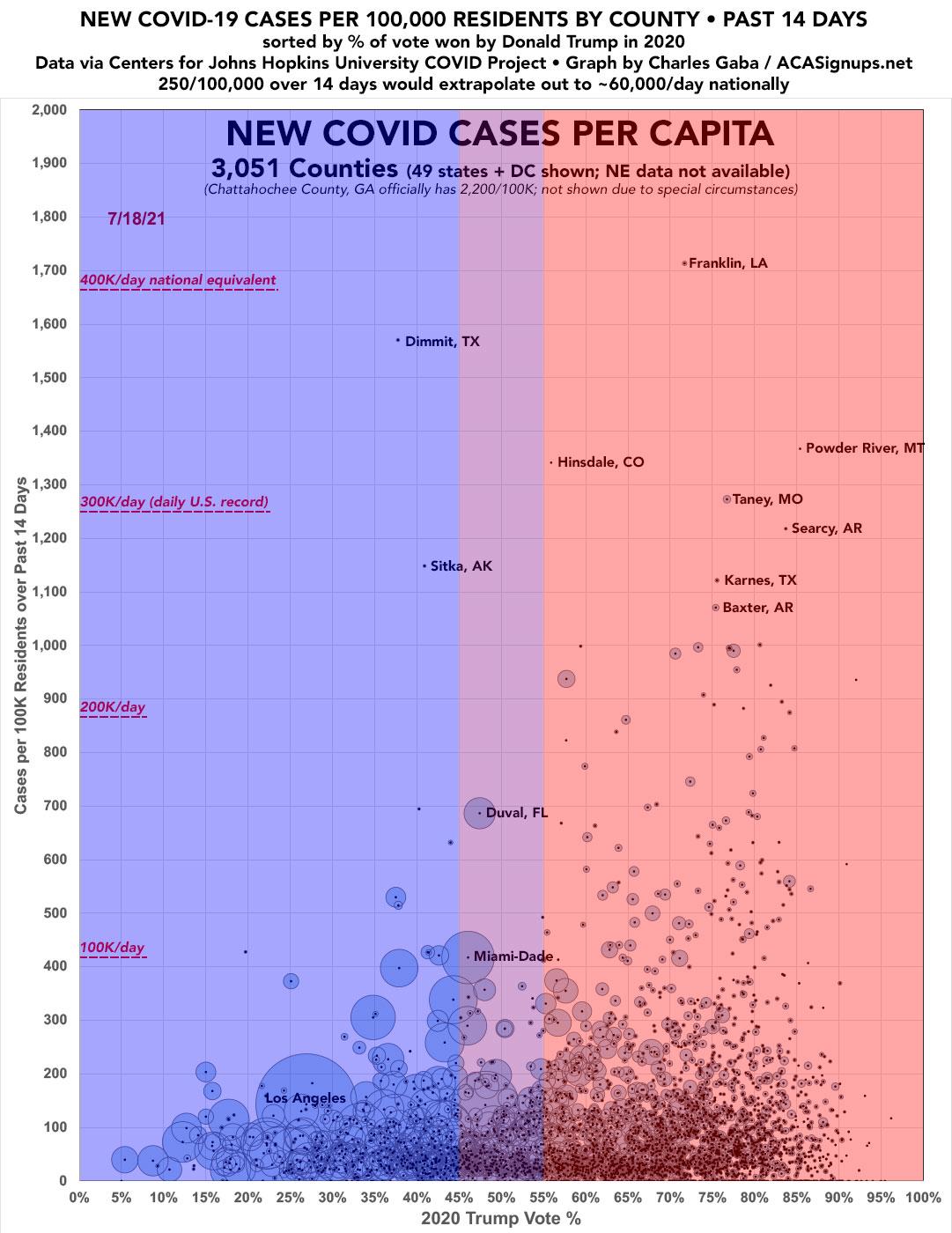 The COVID pandemic situation is an entirely different animal today, so it didn't make much sense to just pick up where I left off. Instead, the graph below displays new case rates only over the past 2 weeks (14 days). I've also decided to switch from a line graph to a scatter plot layout in order to match my county/state-level vaccination rate graphs. I've also changed the scale from cases per 1,000 residents to cases per 100K since that seems to be what most media outlets are going with.