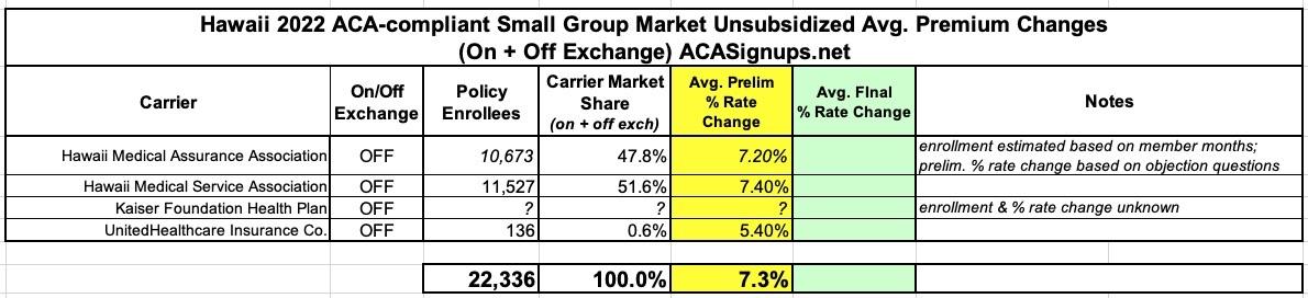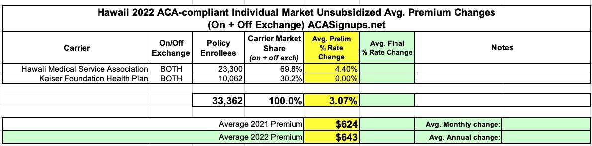 Hawaii: Preliminary avg. 2022 #ACA premiums: 3.1% indy, 7.3% sm. group