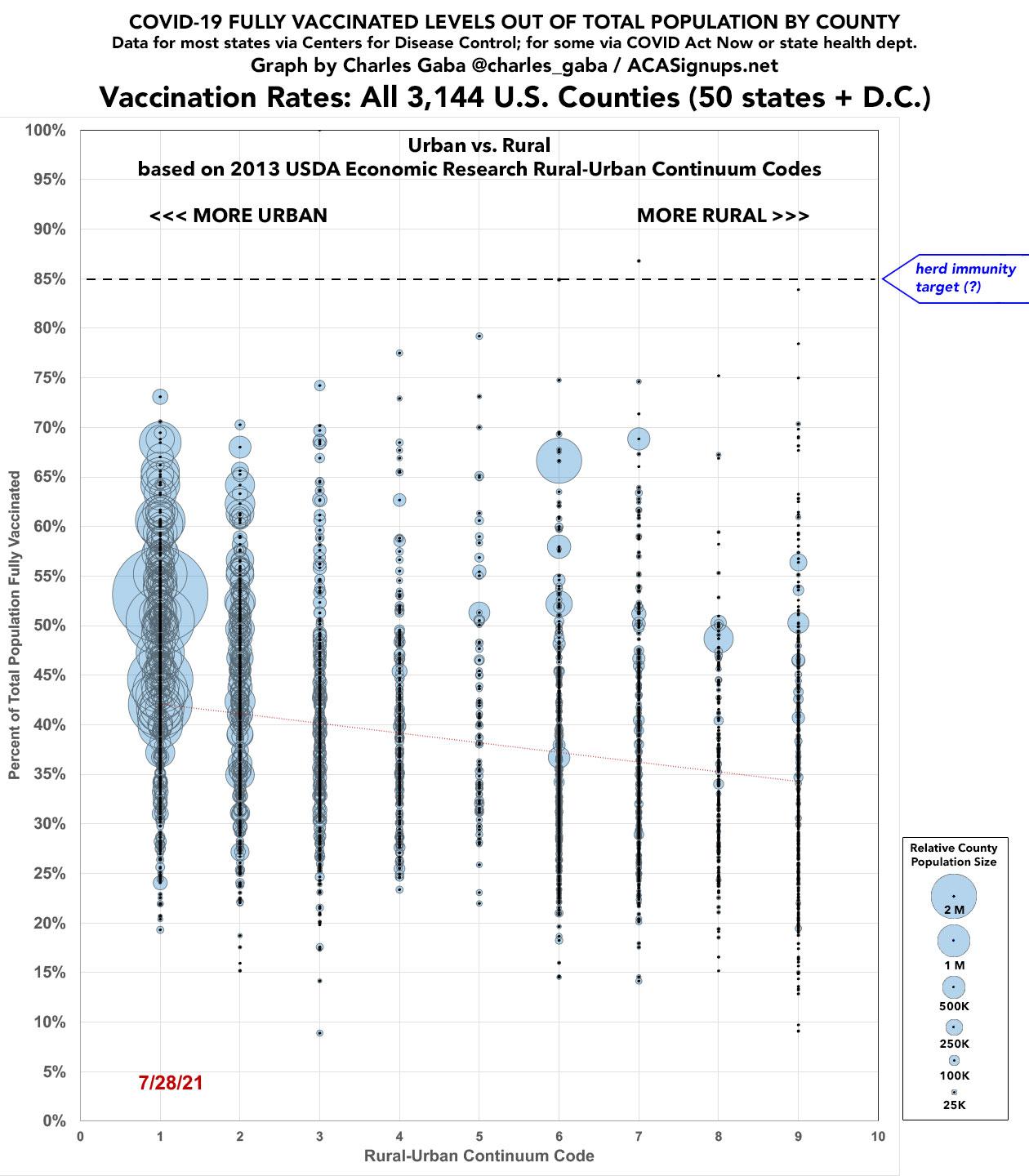- FIRST, I graphed out the fully-vaccinated percentages for the 3,144 U.S. counties in all 50 states +DC based on their overall population density...that is, the total number of residents per square mile. The population of each county is via the U.S. Census Bureau's 2019 estimates; the square mileage of each county comes from the U.S. Census Bureau's 2010 Census results. Here's what it looked like as of July 27, 2021 (note: I had to use a logarithmic scale on the graph in order to fit every county in, since Manhattan (71,490 residents per square mile) has a population density nearly 1.8 million times as high as the Yukon-Koyukuk area of Alaska (0.04/sq. mile):