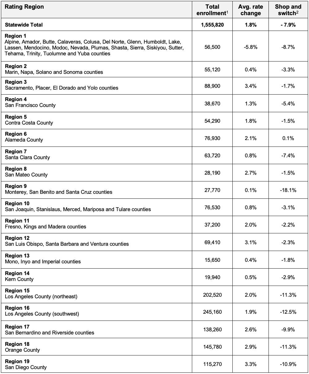 Table 2: California Individual Market Rate Changes by Rating Region