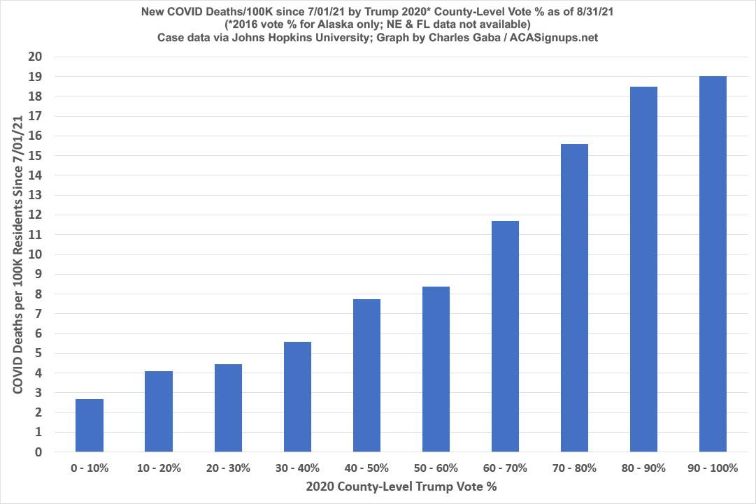 UPDATE: Earlier today, Christopher Ingraham of The Why Axis posted a piece about this very topic called, quite simply, "GOP Covid Policy is killing GOP voters." It mostly covers the same ground I have in this and prior pieces, but it also includes another graph which illustrates the point even better than my bubble graphs do. He groups most of the U.S. population into 5 brackets based on how much of the vote Trump got last year (0 - 20%, 20 - 40%, etc), with vertical bars showing the COVID death rate since July 31st in each group.