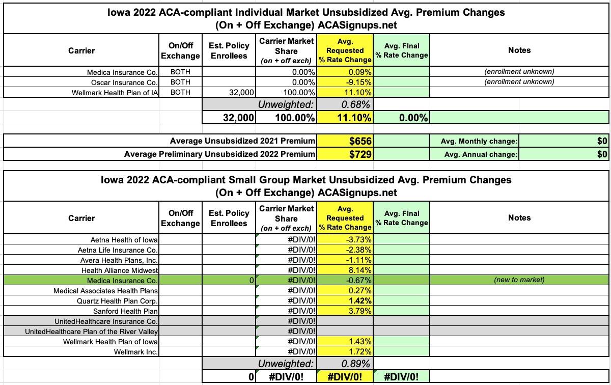 (sigh) Unfortunately, the Iowa Insurance Department is pretty much useless when it comes to individual & small group market rate filing transparency. I can't find any press releases or statements about the 2022 rate filings, they don't list the 2022 Individual market filings at all, their Small Group market filing database is available but a year out of date, and they don't even list any of the ACA-compliant plan filings in the SERFF database.
