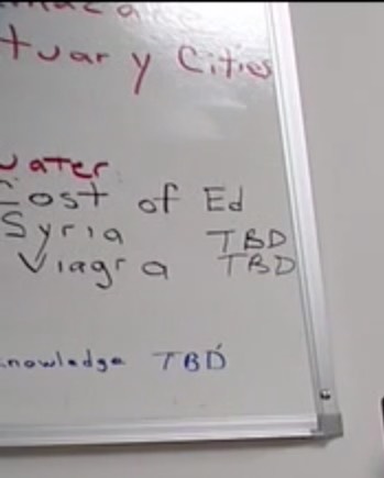 Something about "Sanctuary Cities", followed by something about "Water", "Cost of Education", "Syria (TBD)", "Viagra (TBD)" and "Knowledge (TBD)"