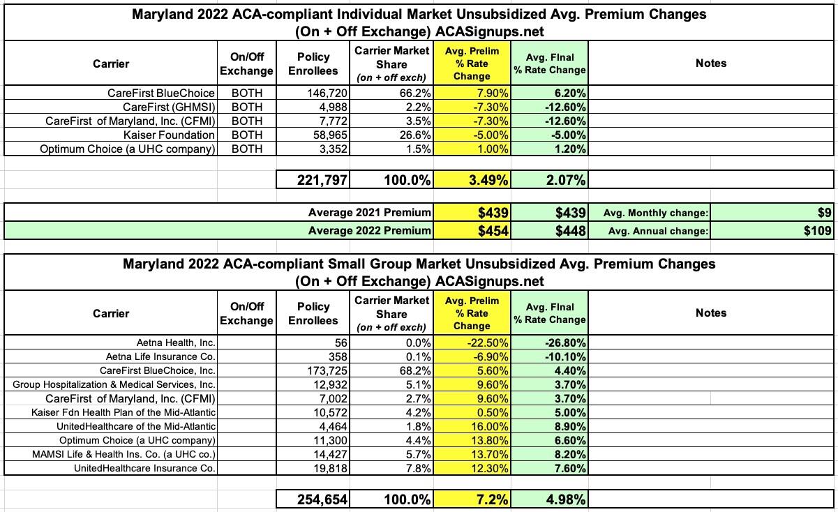 About a week ago, the MD Insurance Administration issued their approved rate changes for the 2022 ACA individual & small group markets: