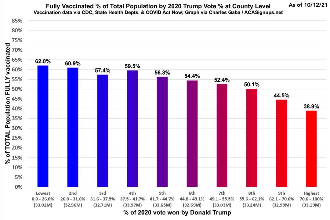Here's what the data above looks like in bar graph format, broken out in rough deciles (tenths of the total population, or around 33.1 million people apiece). The vaccination rate in the bluest tenth of the nation is running around 1.6x higher than the reddest tenth:
