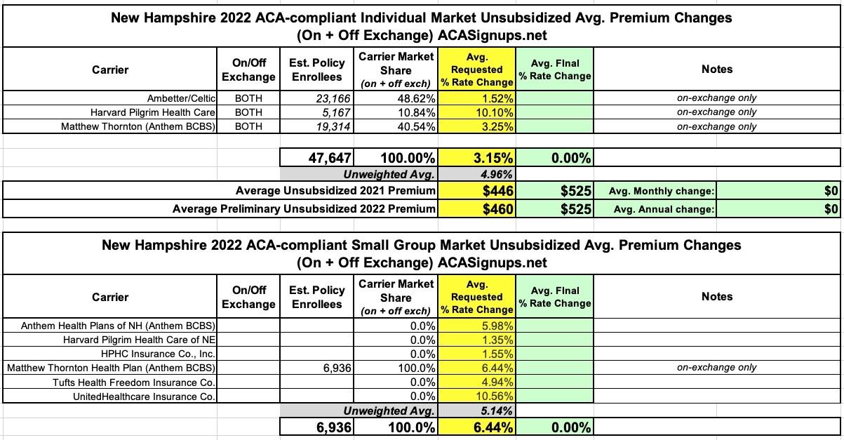 New Hampshire: Preliminary avg. 2022 #ACA premiums: +3.2% indy; +5.1% sm. group (unweighted)