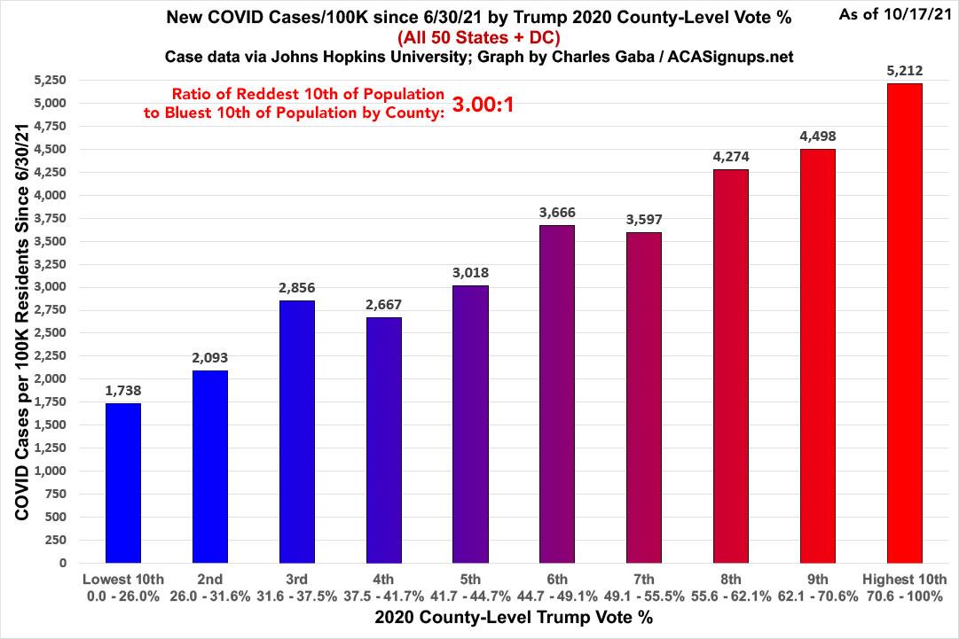The case rate is pretty much the same as it was last week, with new cases running 3x higher per capita in the reddest tenth of the country than the bluest tenth...
