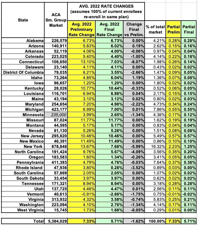 It's also worth noting that assuming the math above is fairly accurate, it looks like the national weighted average premium increases for 2022 in the small group market are around 5.4% vs. 2021 rates, a bit higher than the 3.5% weighted average on the individual market.