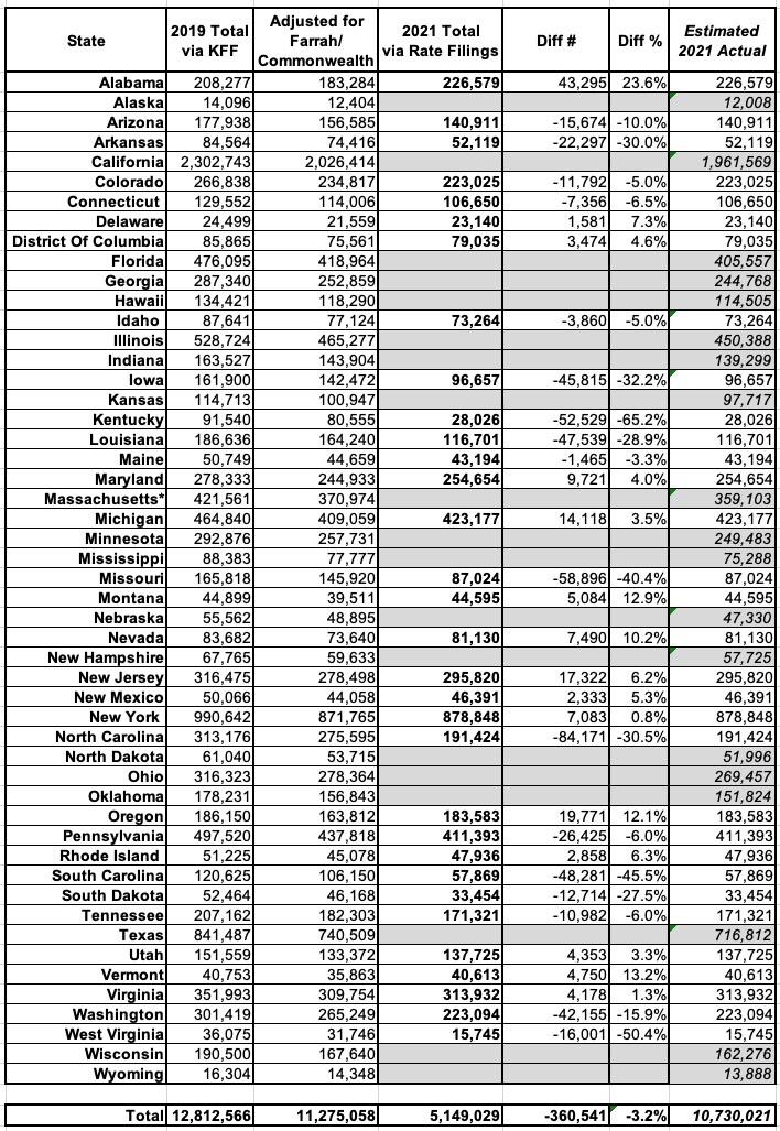 To get rough estimates of the 2021 small group enrollment in the missing 18 states, I've first adjusted Kaiser's 2019 estimates down by 12% to bring them in line with the Farrah/Commonwealth Fund methodology, and then compared the 2021 numbers for the other 33 states against them. On average, they're 3.2% lower, so I've applied that as follows: