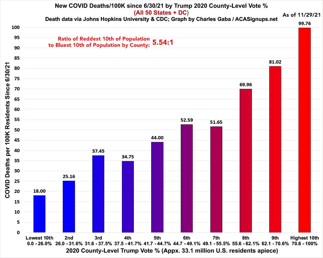 The ratio of death rates has also begun to shrink, with the rate in the reddest tenth now 5.54x higher than in the bluest tenth, down from 6.0x higher five weeks ago: