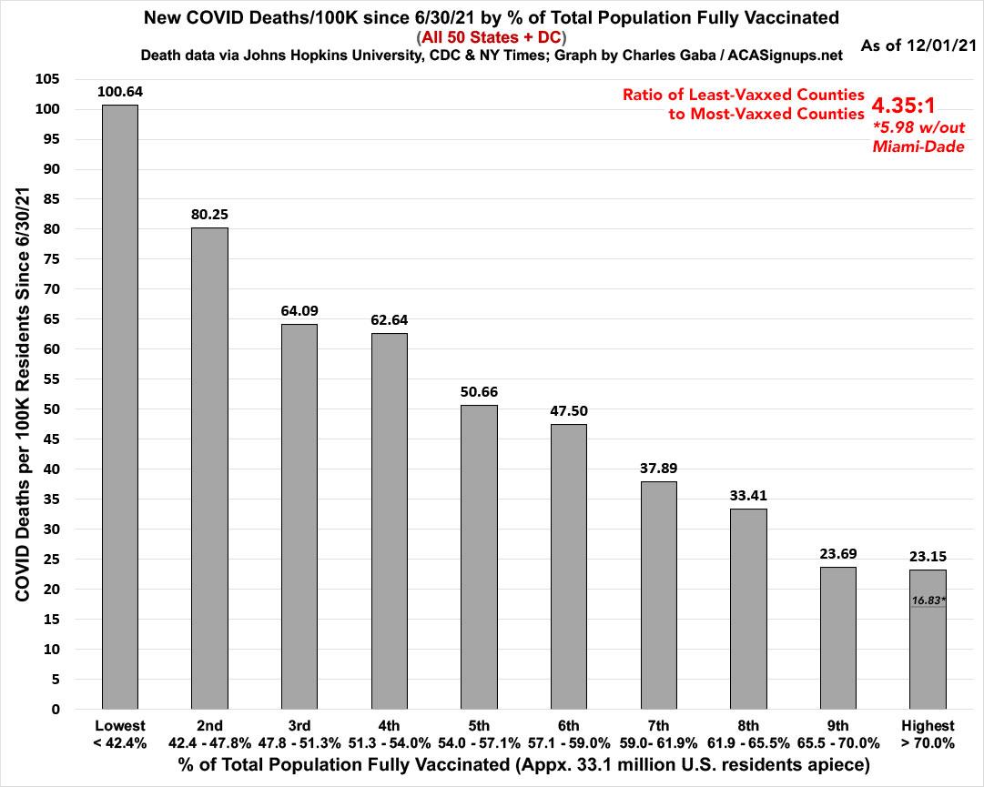Note: As I explained in a recent blog post, Miami-Dade County is a massive outlier when it comes to the relationship of cases/deaths to the official vaccination rate, and I strongly suspect this is due to a substantially high incidence of "vaccine tourism" combined with the "snowbird" effect. As such, I've started also breaking out what the most-vaccinated tier would look like in terms fo both case & death rates if Miami-Dade County was disregarded. As you can see, it's pretty dramatic in both cases:
