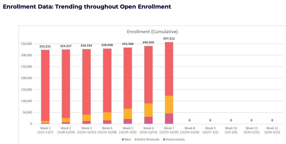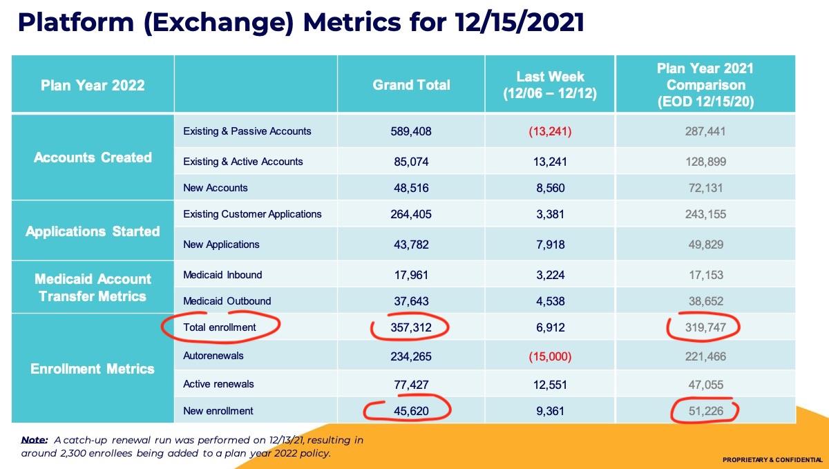 The main number: As of 12/15/21, 357,212 PA residents had selected (or been auto-renewed into) 2022 Qualified Health Plans (QHPs). This is up 11.7% vs. the same point last year.