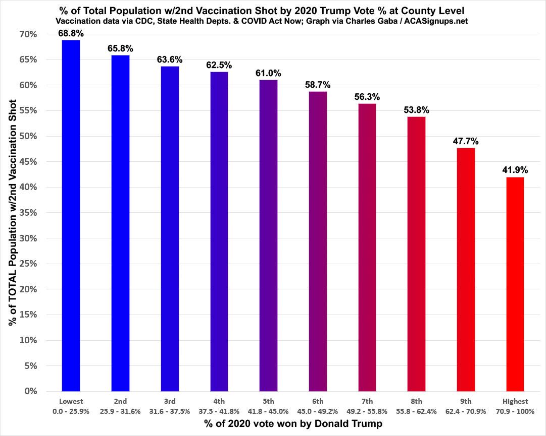 Here's what the data above looks like in bar graph format, broken out in rough deciles (tenths of the total population, or around 33.1 million people apiece). The vaccination rate in the bluest tenth of the nation is running 64% higher than the reddest tenth: