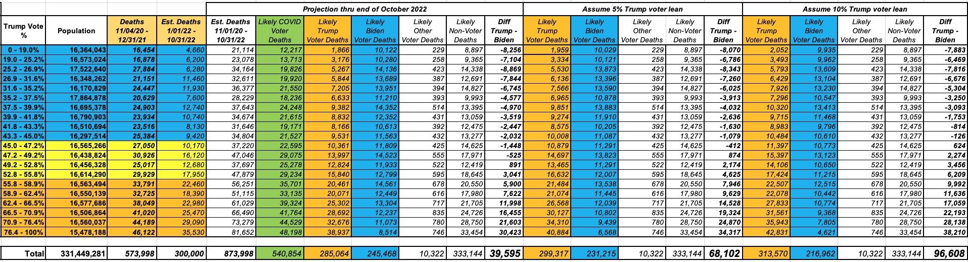 With this in mind, and seeing how it's the end of the year, I decided to dig deeper into the data to try and come up with a more granular estimate of how many Trump voters vs. Biden voters have died of COVID since November 4, 2020...and even to look ahead and see what this gap might look like in November 2022.